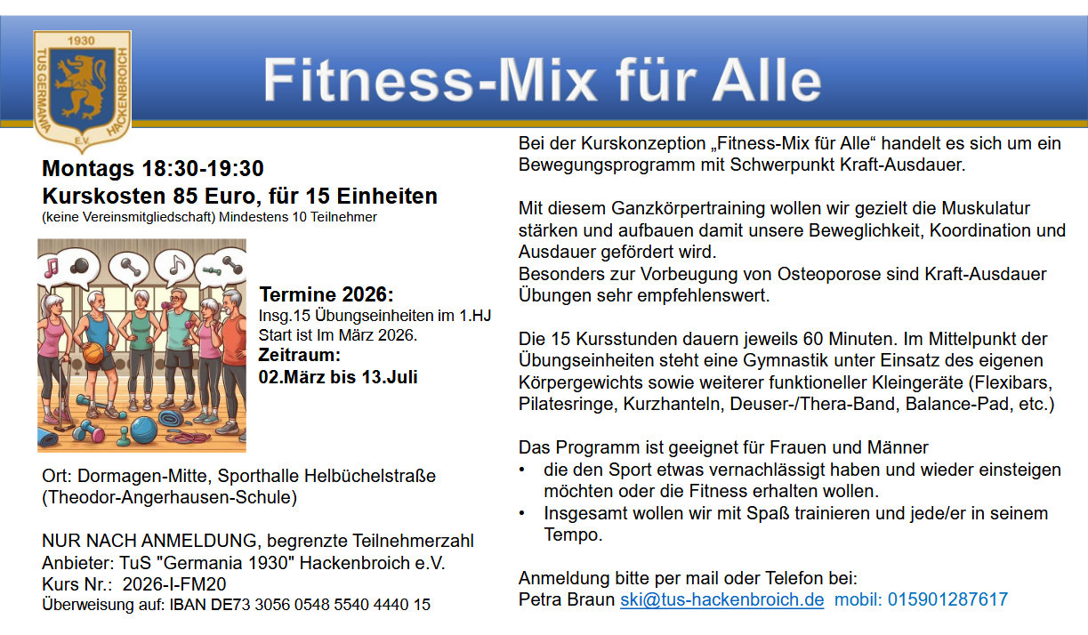 Bei der Kurskonzeption „Fitness-Mix für Alle“ handelt es sich um ein Bewegungsprogramm mit Schwerpunkt Kraft-Ausdauer.